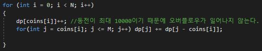 모든 동전을 dp[M]까지 계산해주고, dp[M]을 출력해주면 정답이 됩니다!!