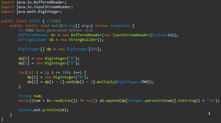 dp[i] = dp[i - 1] + 2 * dp[i - 2]; //dp[1] = 1이기 때문에 생략합니다.