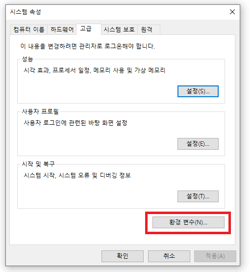 이렇게 나오네요!! 저기서 [환경 변수(N)...]을 클릭해줍니다.