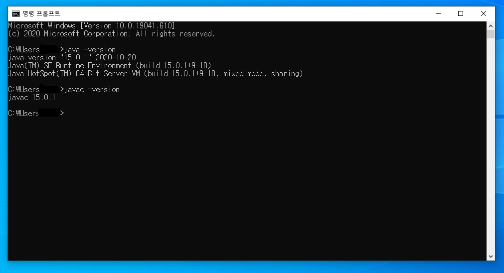 cmd를 켜준 뒤 java -version과 javac -version을 입력해봅니다.