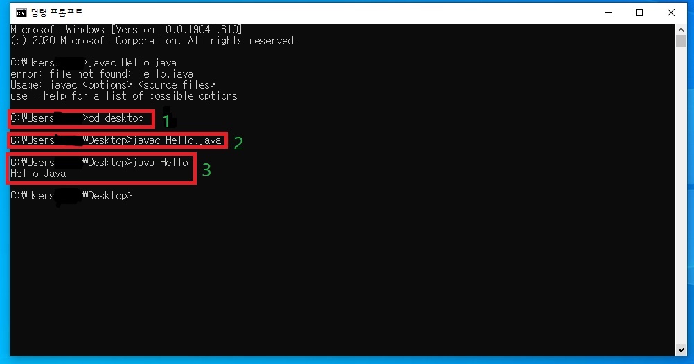 저는 Hello.java 파일을 바탕화면에 저장을 시켰기 때문에 바탕화면 위치로 다시 실행을 시켜볼게요.
