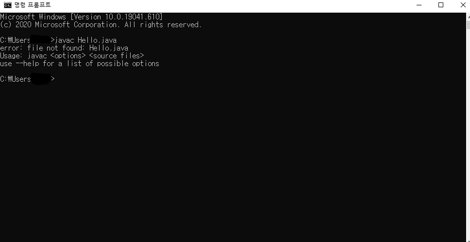 만약에 "javac은(는) 내부 또는 외부 명령, 실행할 수 있는 프로그램, 또는 배치 파일이 아닙니다."라고 출력이 된다면 환경 변수에 추가한 경로가 잘못된 것이니 위에 추가한 환경 변수 값들을 다시 잘 확인해보고 수정한 후에 다시 실행시키면 됩니다.