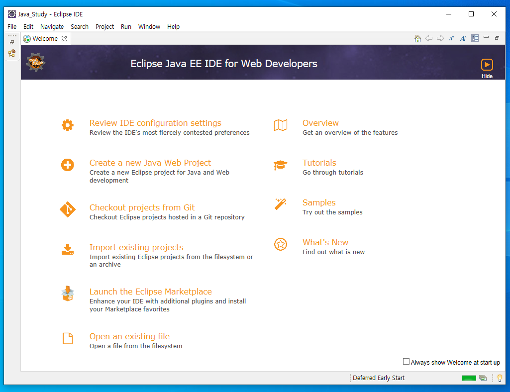 Eclipse IDE for Enterprise Java Developers는 위의 기본적인 자바 개발툴과 함께 서버같은 추가적인 기능들을 제공합니다.