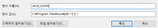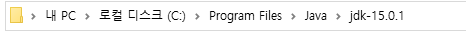 저는 변수 이름을 JAVA_HOME으로 설정을 해주었습니다. 그리고 변수 값은 아까 위에 SE가 설치된 폴더 경로를 넣어주면 됩니다. 폴더 경로는 [내 PC -> 로컬 디스크 (C:) -> Program Files -> Java]에 들어가면