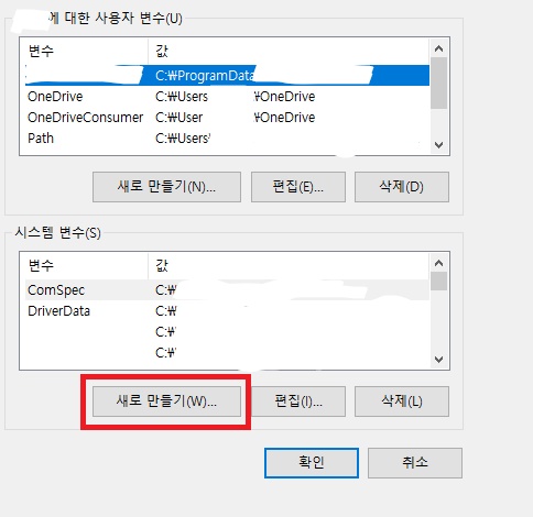 빨간 네모 안에 새로 만들기를 눌러줍니다. 저 새로 만들기는 자바 경로를 잡아줄 시스템 변수를 만드는 것이기 때문에 변수 이름과 변수 값을 잘 써주어야 합니다.