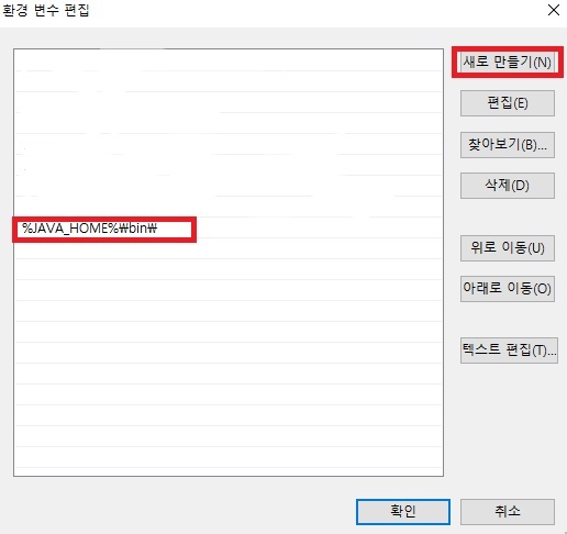 새로 만들기를 눌러 주신 후 저기 빨간 네모 안에 있는 것처럼 %JAVA_HOME%\bin\을 넣어주시면 됩니다.
