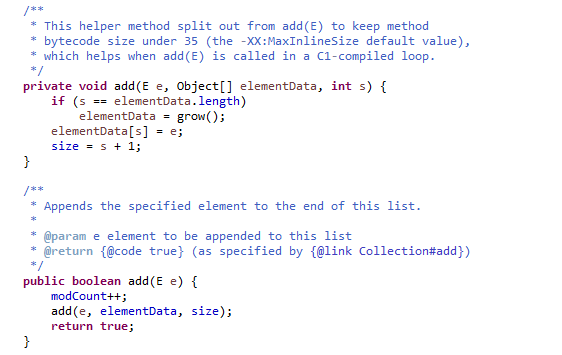 만약 (elementData.length == size)가 값이 true가 되면 grow() 메소드를 호출해서 elementData에 넣어줍니다. 그리고 elementData에 값을 추가해주고 있습니다.