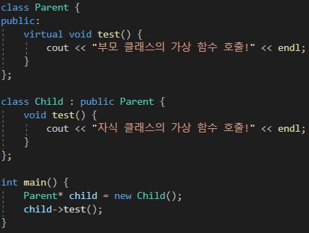 test 함수는 가상 함수이고 child 변수가 업캐스팅된 변수이기 때문에, 할당된 Child 클래스를 확인합니다.