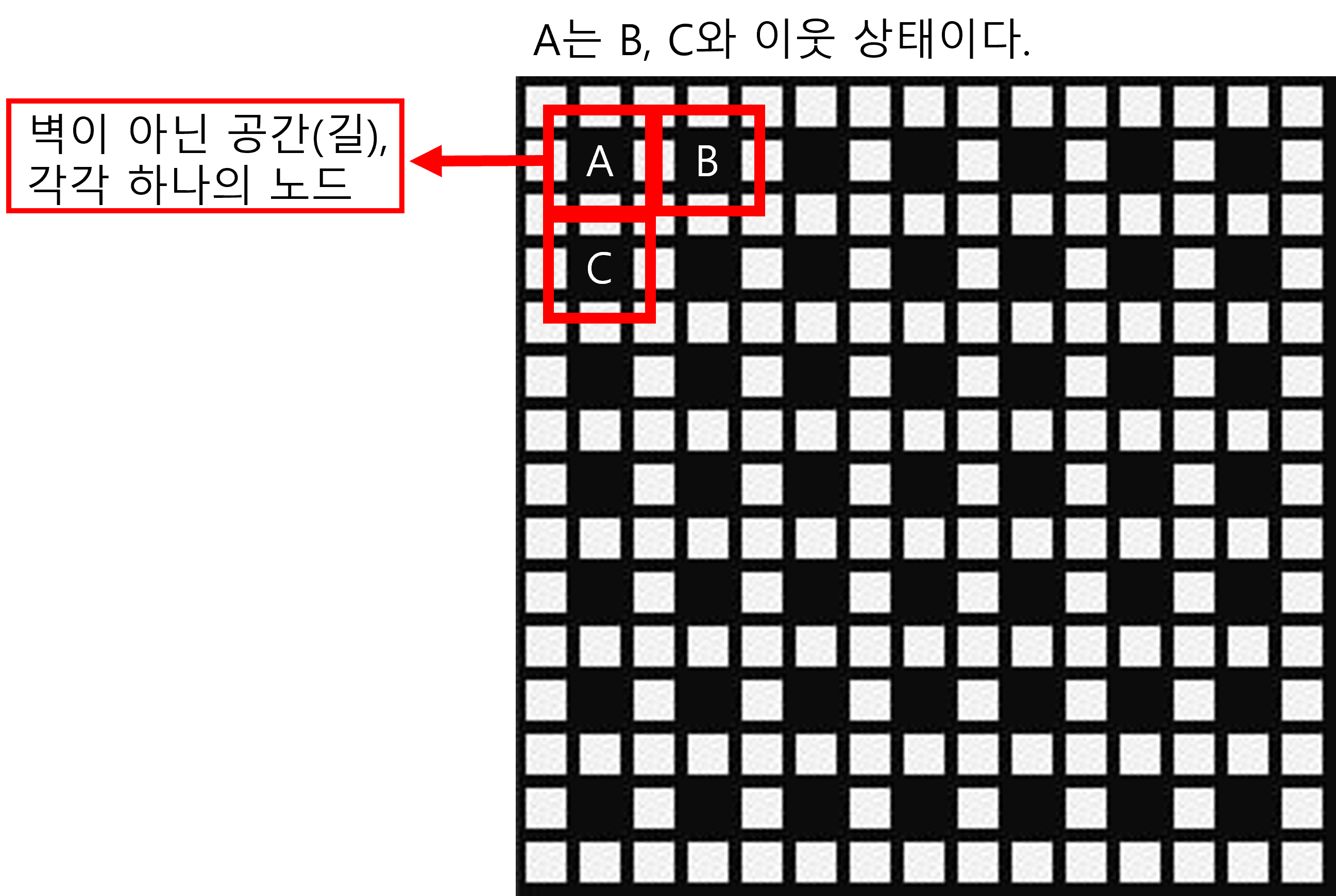 - 4. 현재 노드와 연결할 노드 사이의 벽을 없앤다. 즉, 두 노드는 이어진 길이 된다.