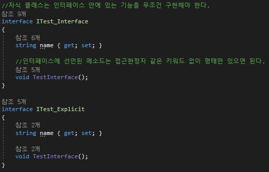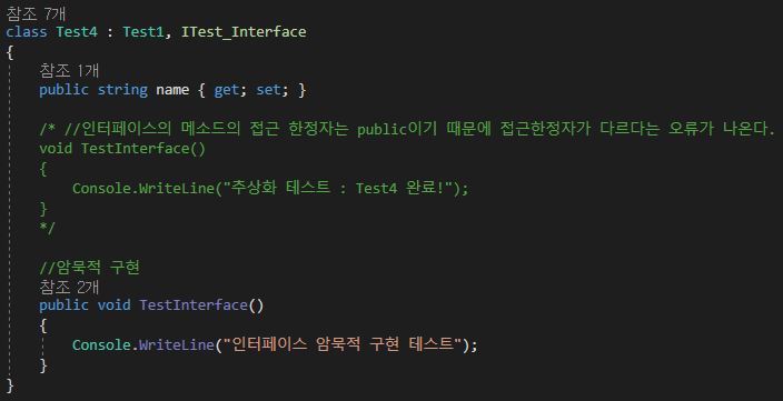 위의 코드에서 ITest_Interface 인터페이스를 참조하여 명시적 구현으로 구현한 메소드를 사용하거나,