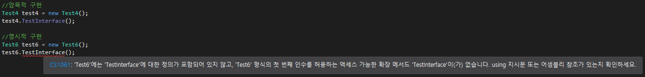 하지만, 명시적 구현은 다른 클래스에서 객체를 통해 직접 접근 시 오류가 나는 것을 볼 수 있습니다.
